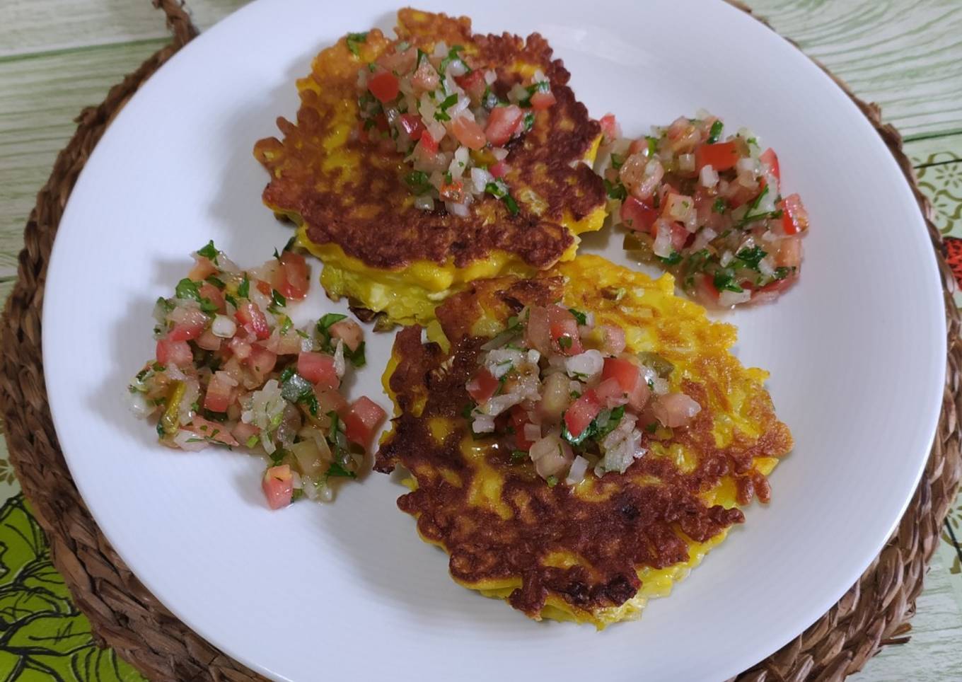 - Cocinamos las tortas con la sartén tapada hasta que estén bien cocinadas y después les damos la vuelta y tapamos otra vez hasta que estén doradas. Emplatamos las tortas poniéndolas en un plato: dos tortas acompañando con salsa pico de gallo y listo para comer.