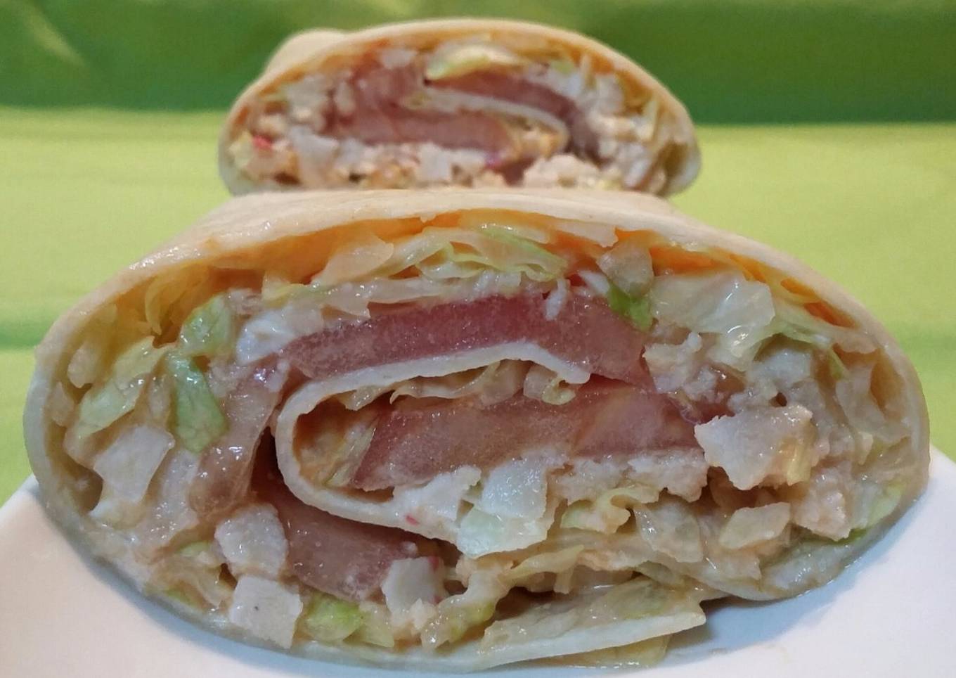 - Sobre una tortita especial para wraps pondremos una cama de lechuga bien picada. También podéis usar tortitas de tacos pero os saldrán más cortos.